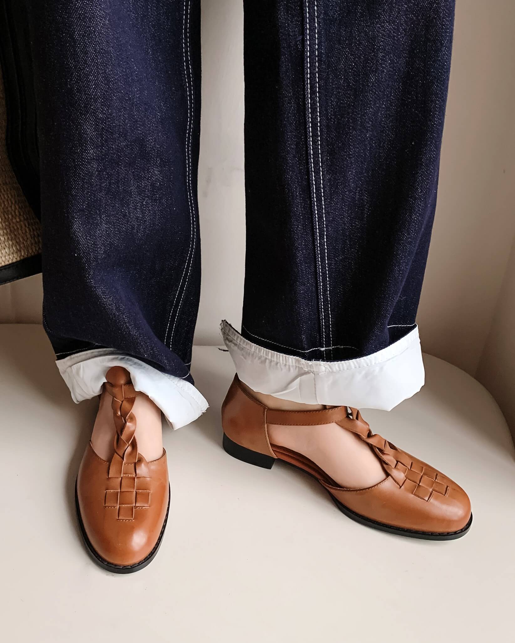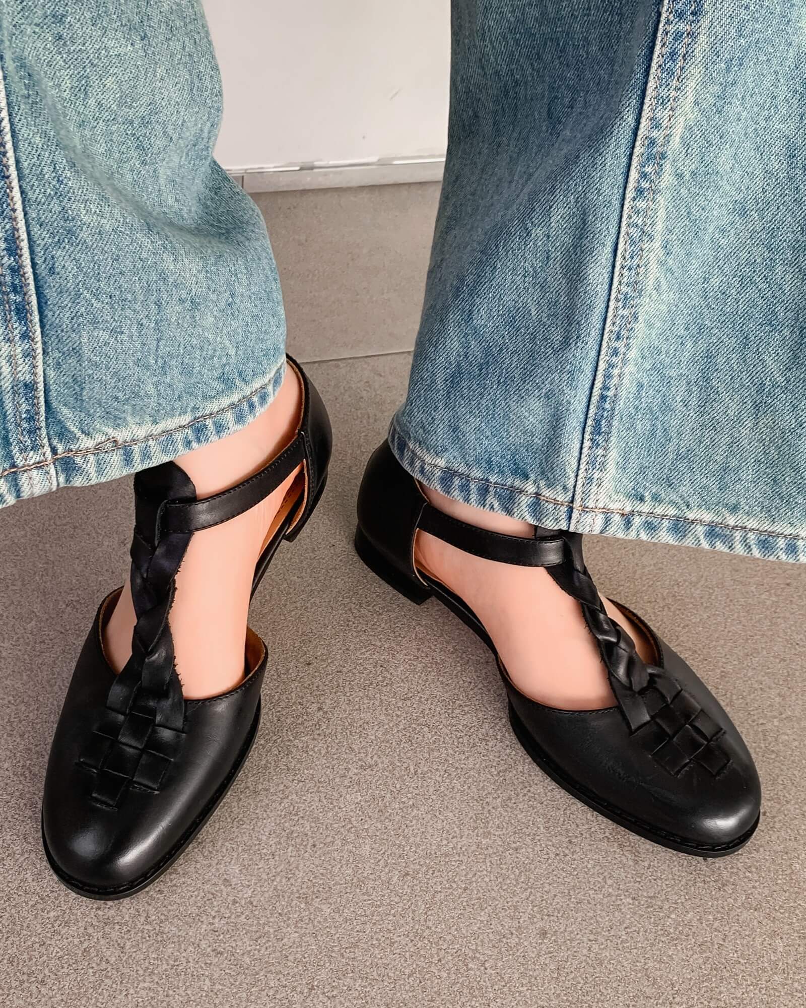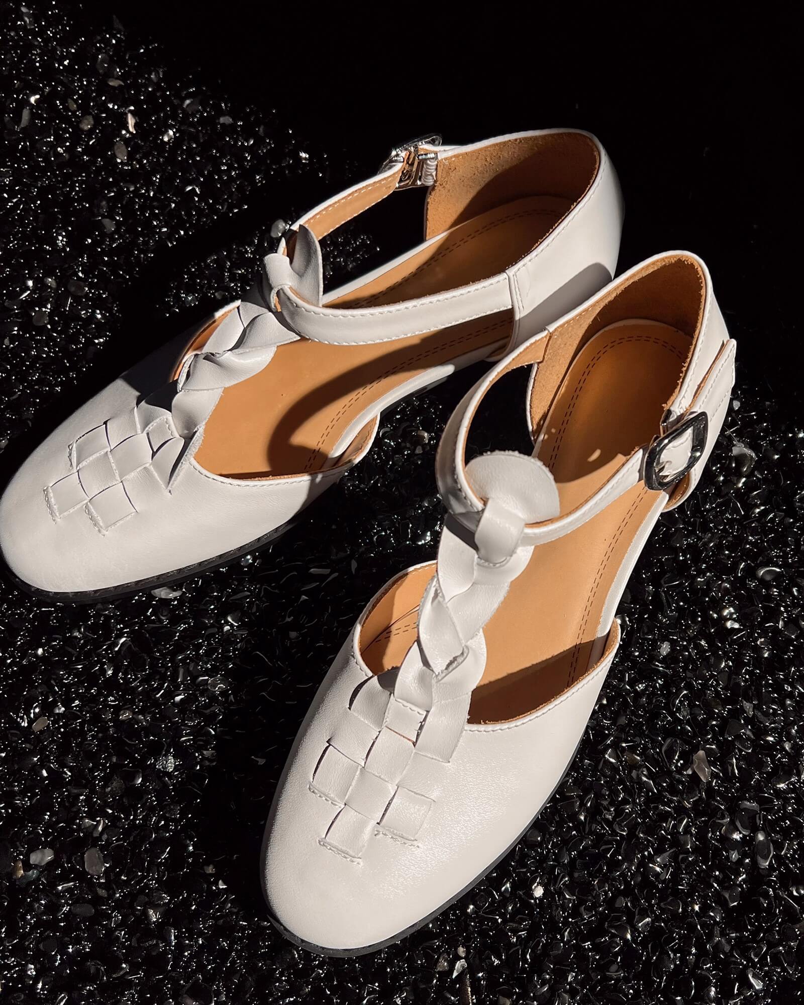 La tira en T trenzada hace que estas sandalias destaquen, tienen parte superior de cuero en jaula, punta redonda y tacón plano para caminar todo el día.