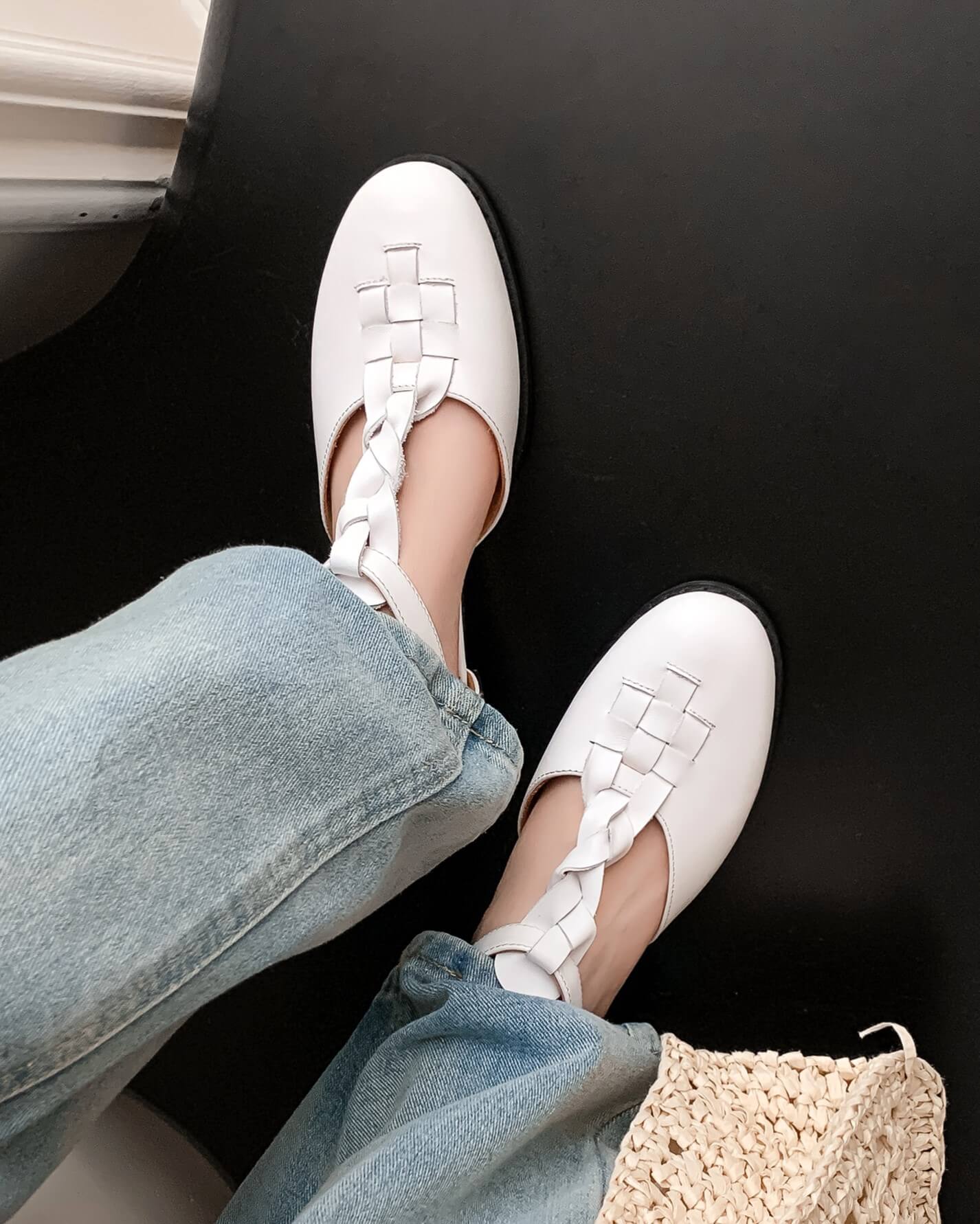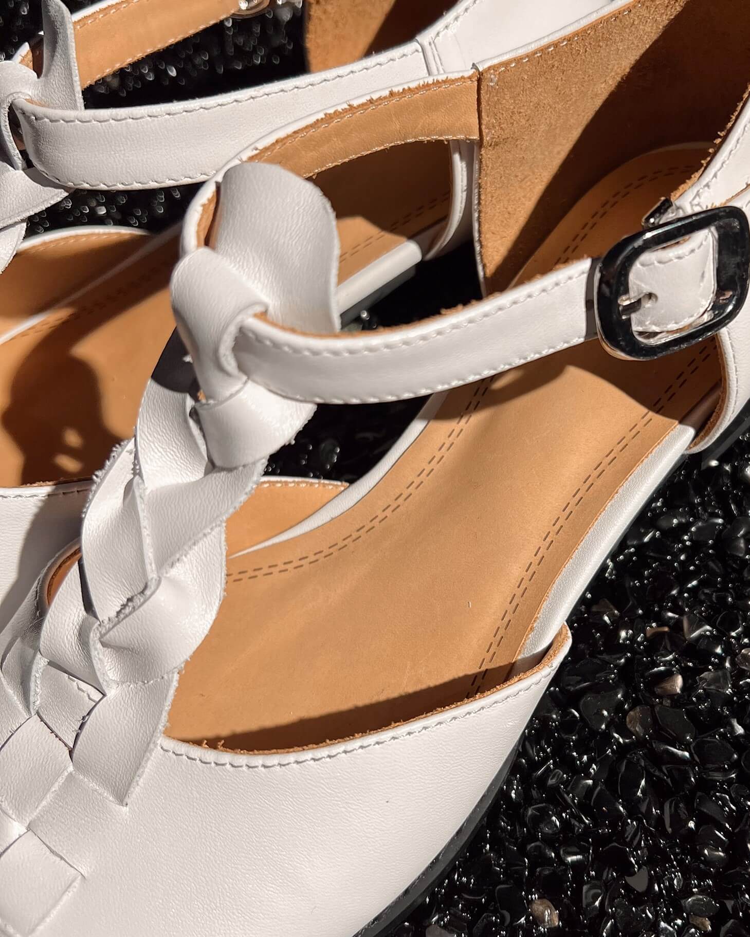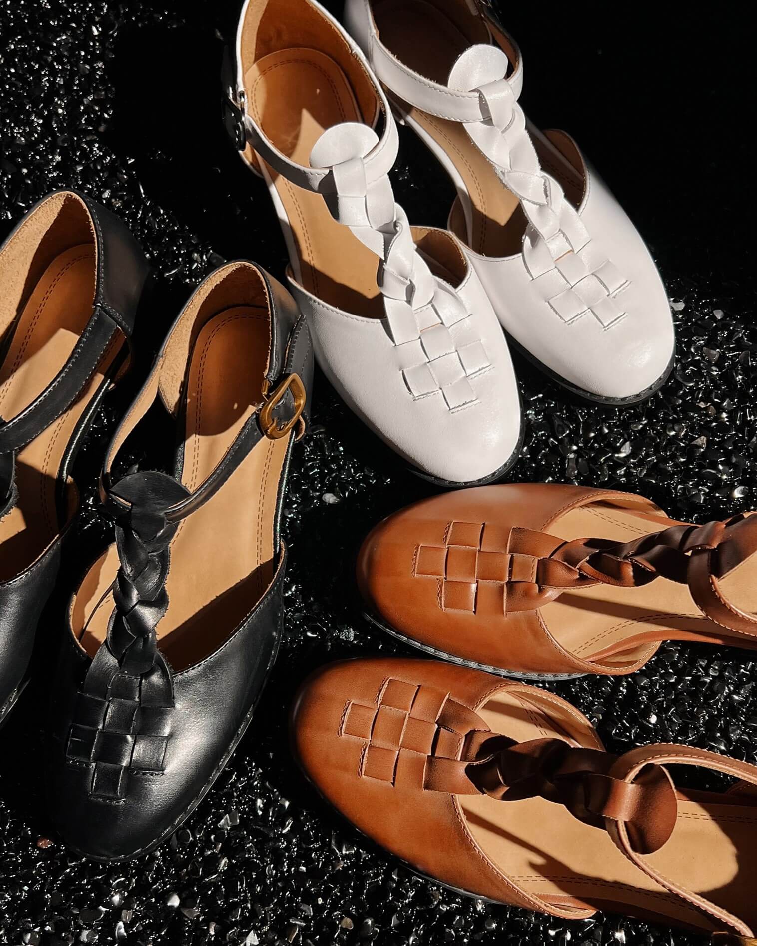La tira en T trenzada hace que estas sandalias destaquen, tienen parte superior de cuero en jaula, punta redonda y tacón plano para caminar todo el día.