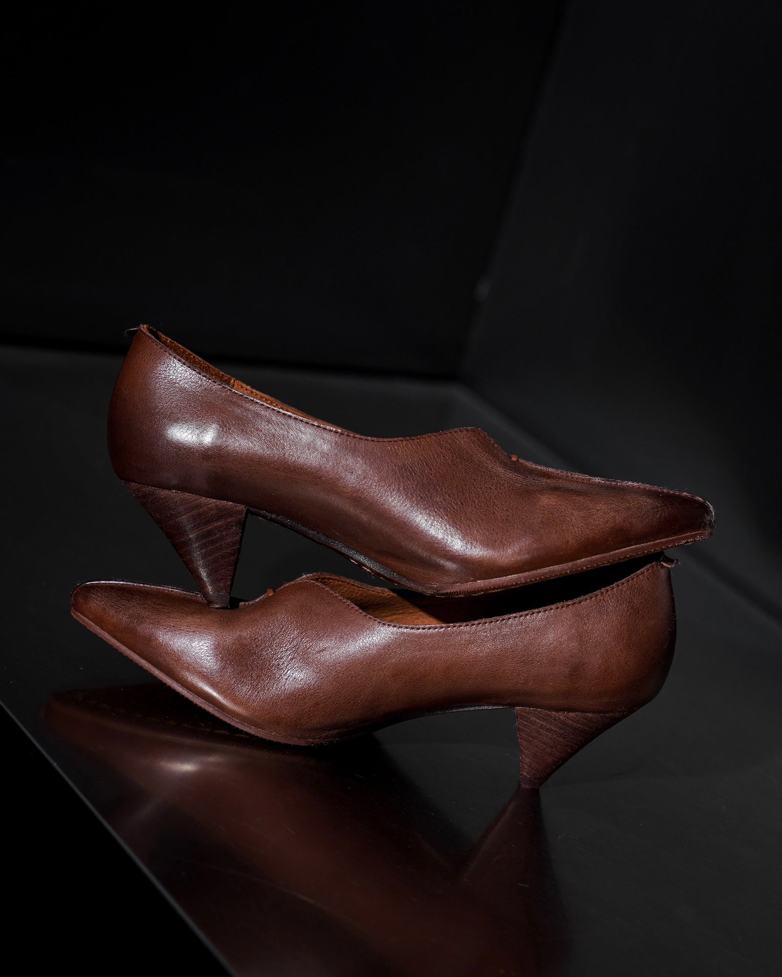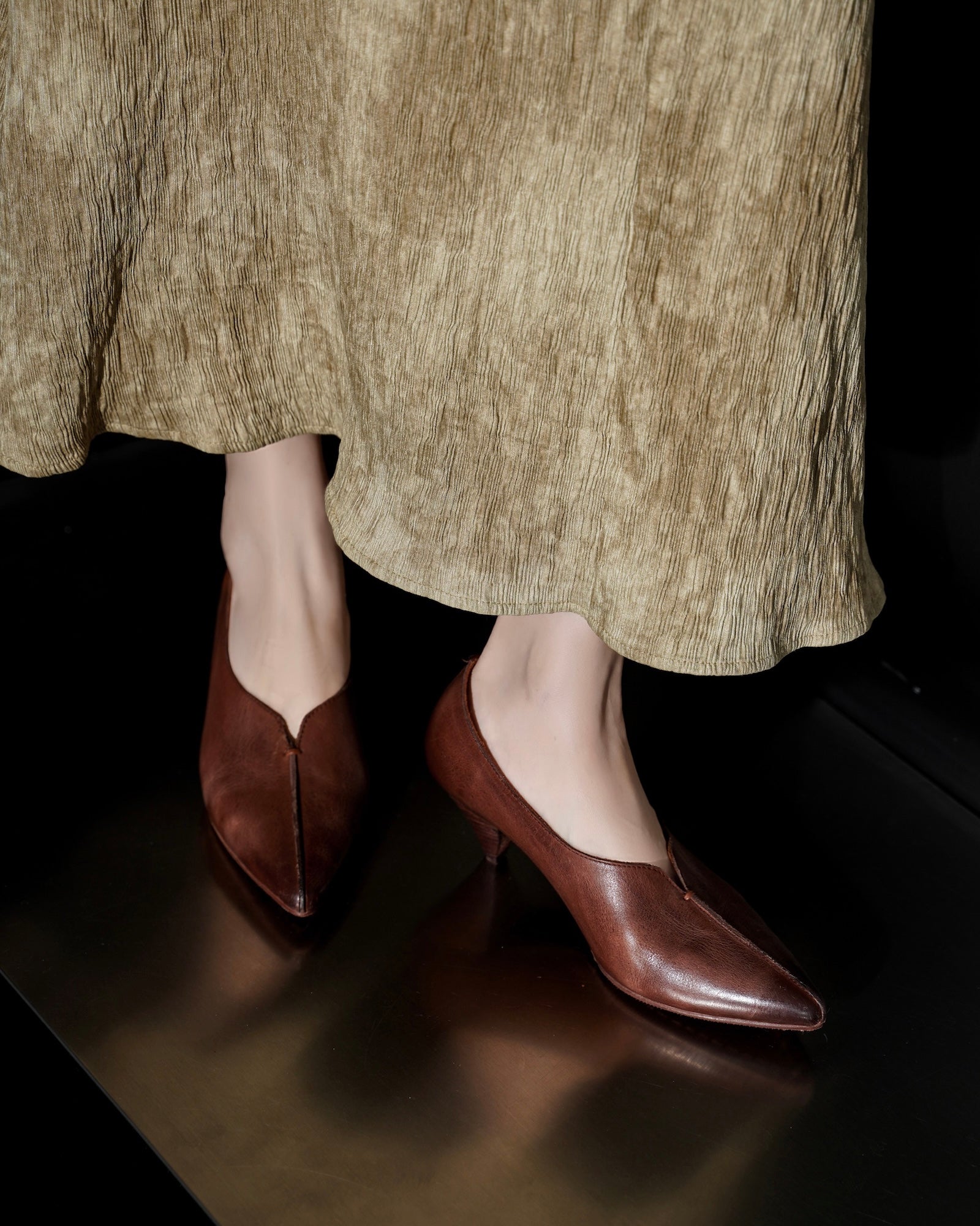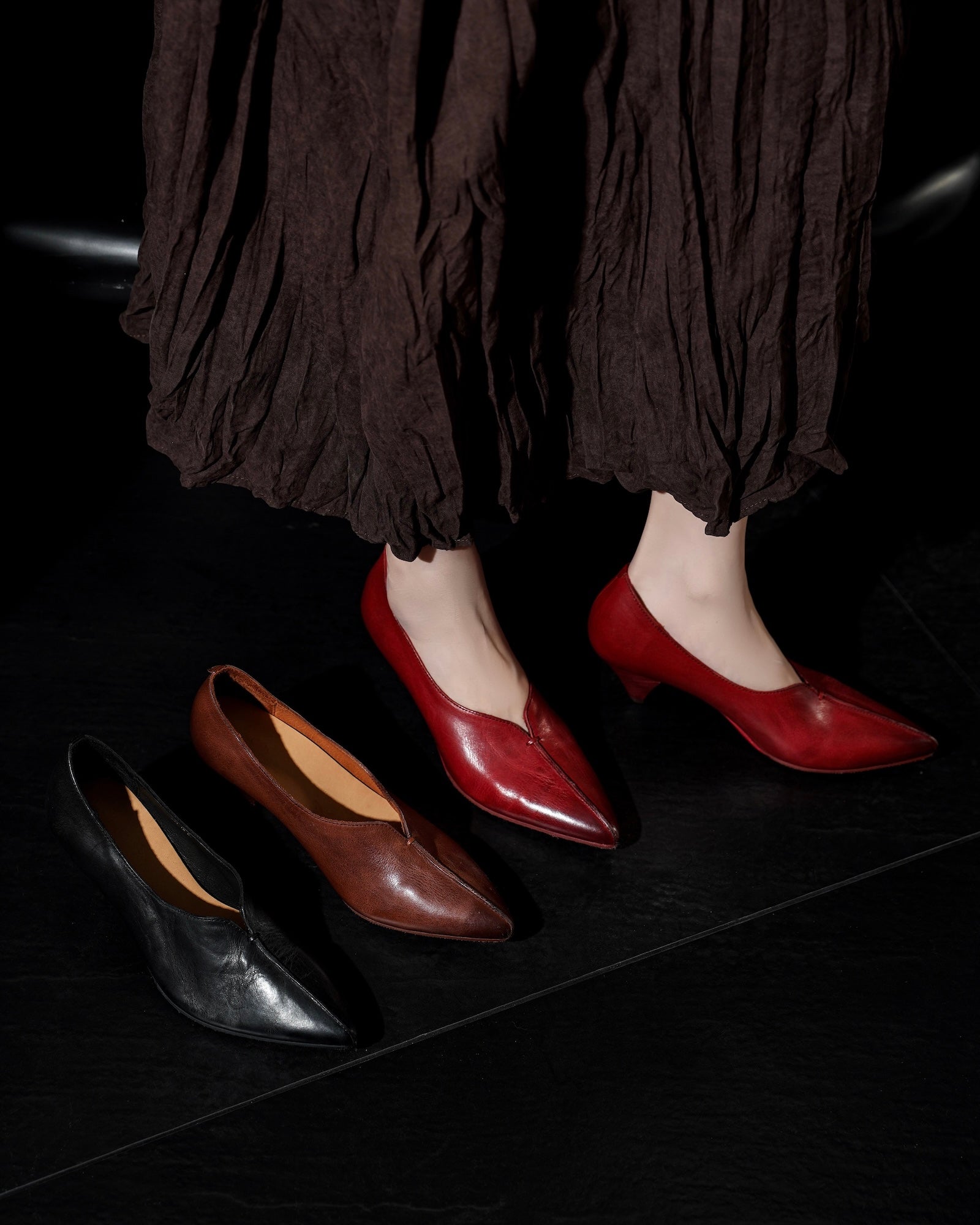 Zapatos de punta puntiaguda con diseño de dos piezas. Montados sobre un tacón cónico resistente que proporciona estabilidad y un levantamiento elegante.