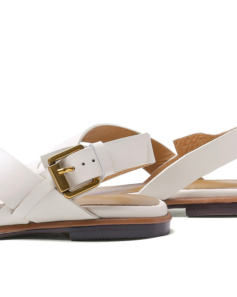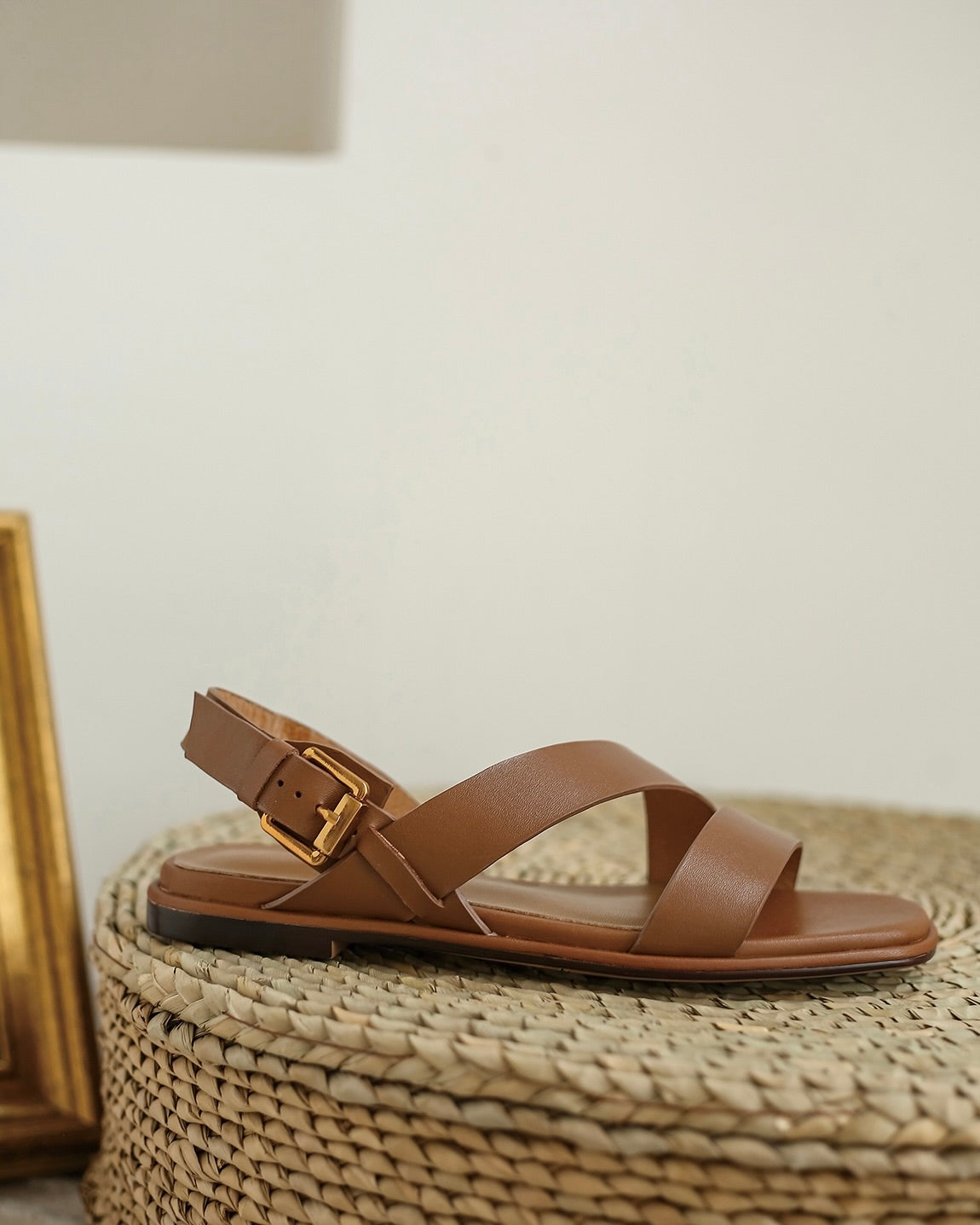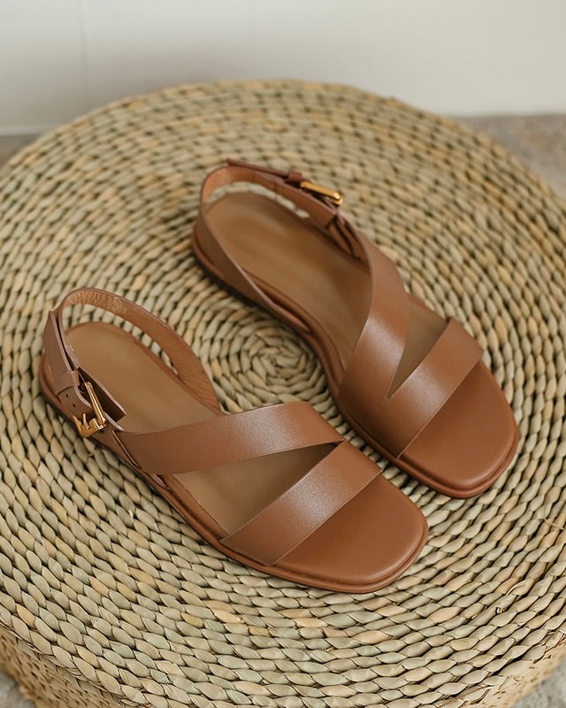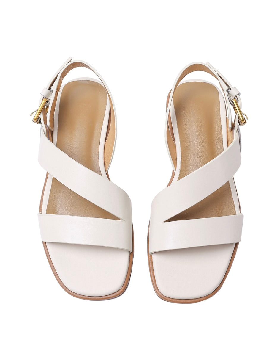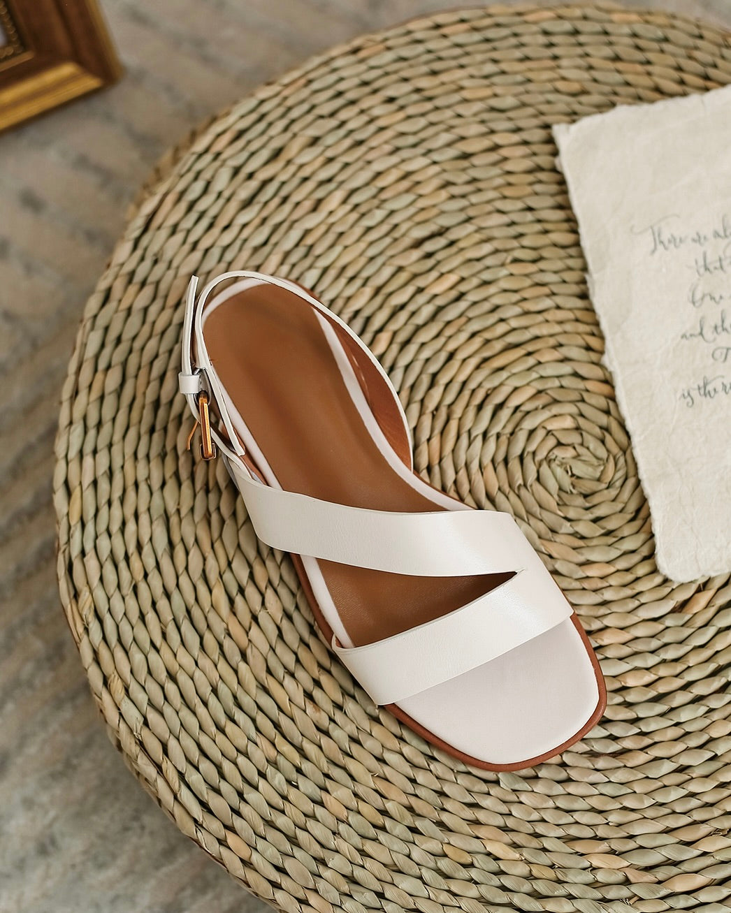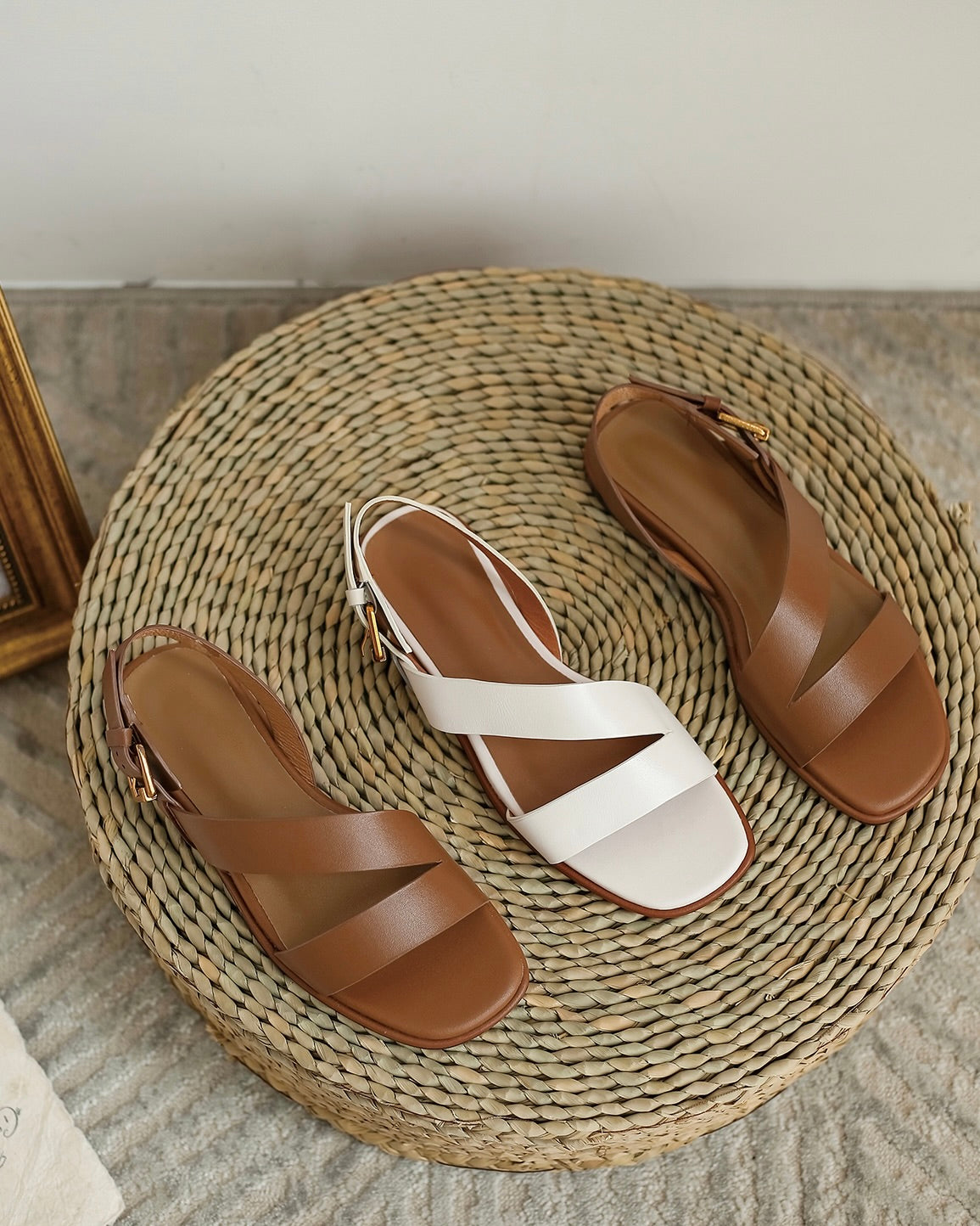 Estas sandalias planas abiertas con punta cuadrada cuentan con una correa de cuero asimétrica y un diseño destalonado para una apariencia única y elegante.