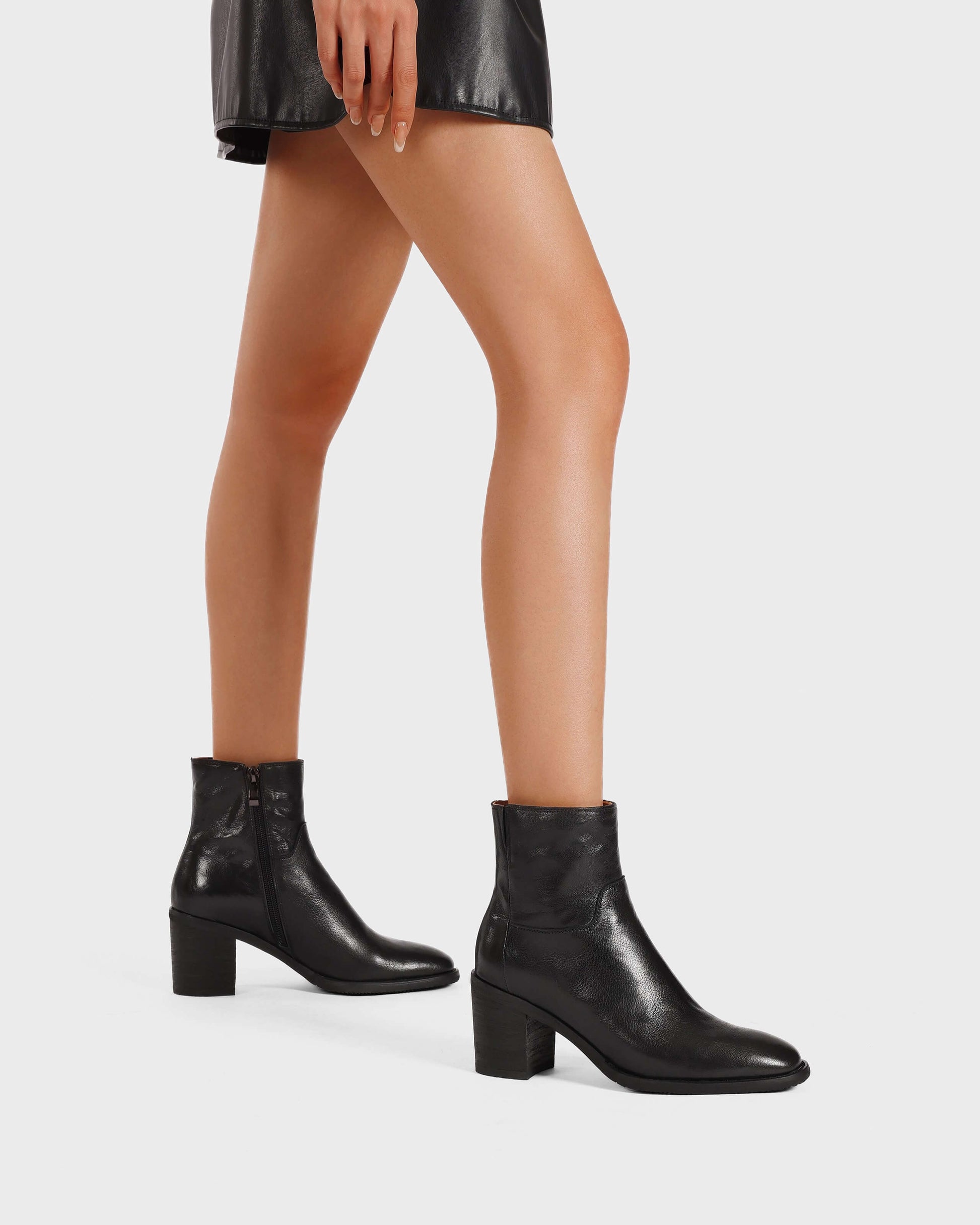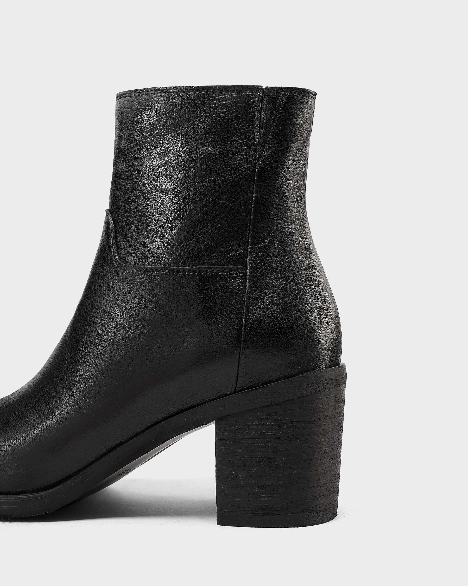Puntera redonda, tacón en bloque, cremallera lateral para cierre.