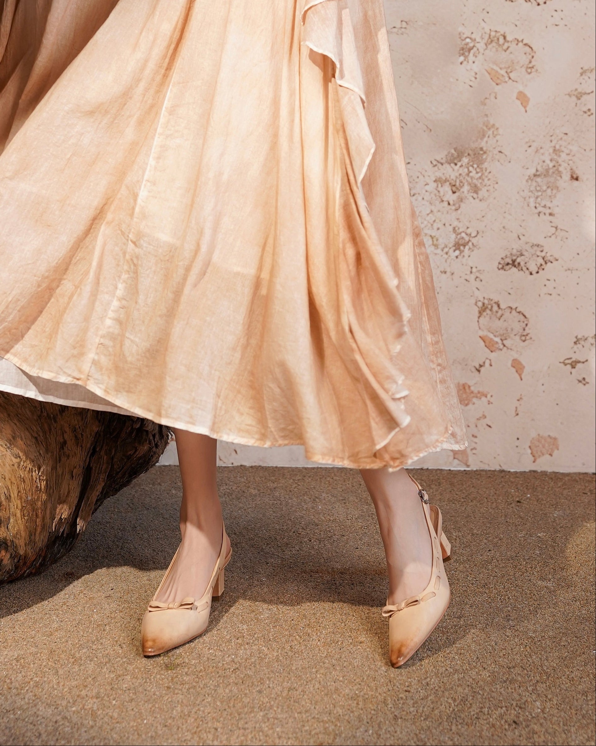 Pointed toe slingback features a bow-tie on the leather upper, set 5.5cm block heels.