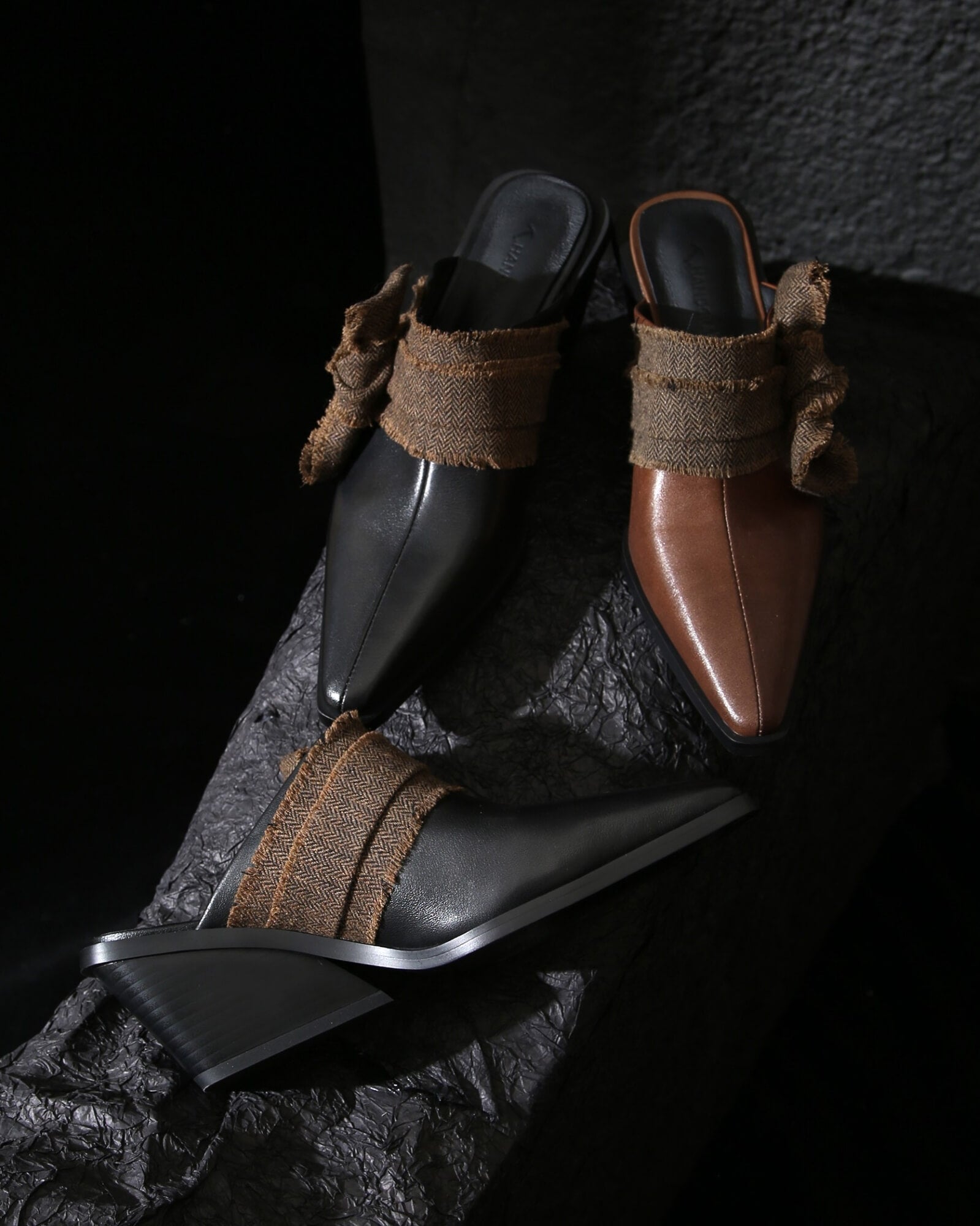 Estos mules con punta en punta presentan un diseño sin espalda y una parte superior de cuero adornada con un lazo de tela. El tacón de cuña engastado añade un toque de sofisticación y comodidad.