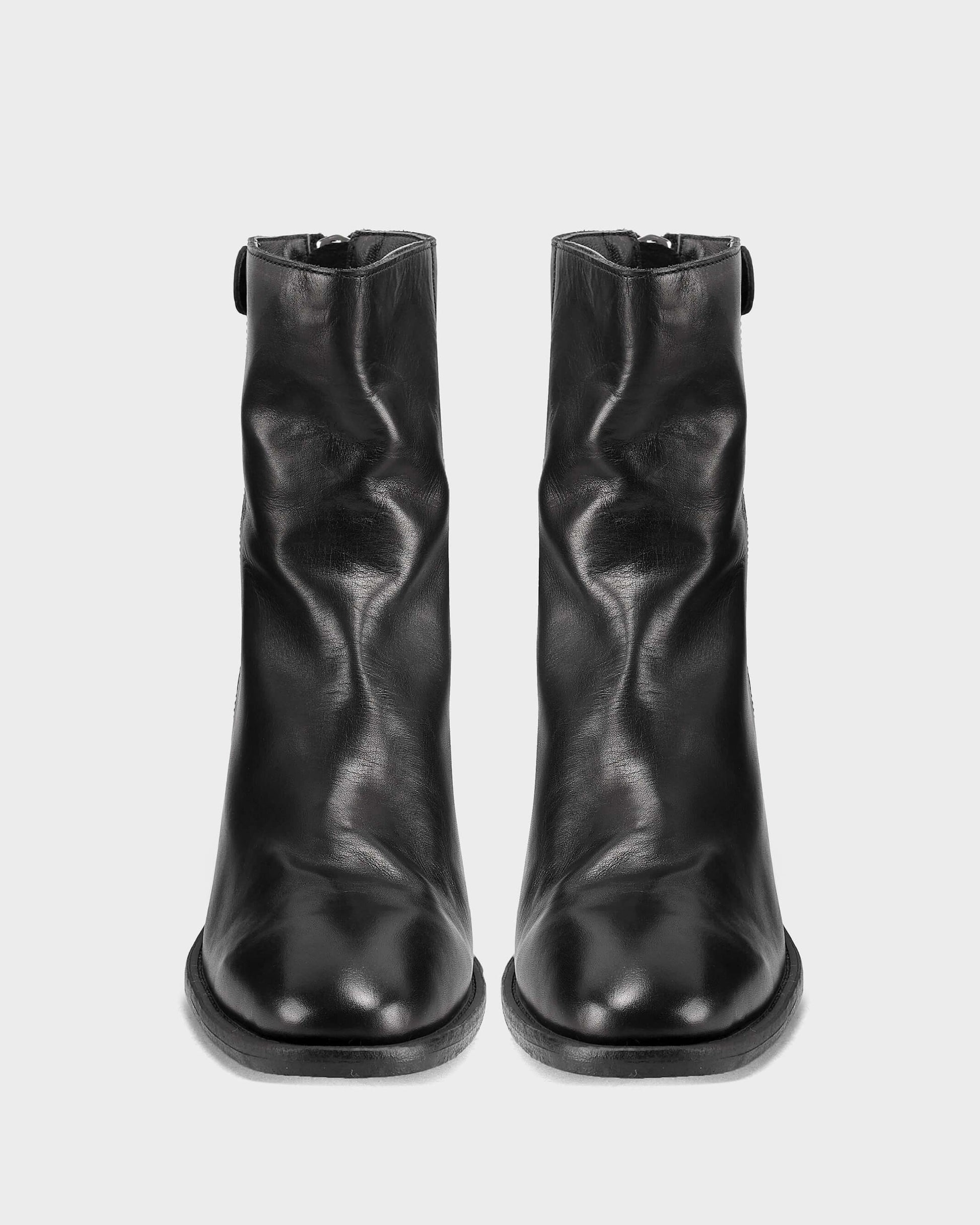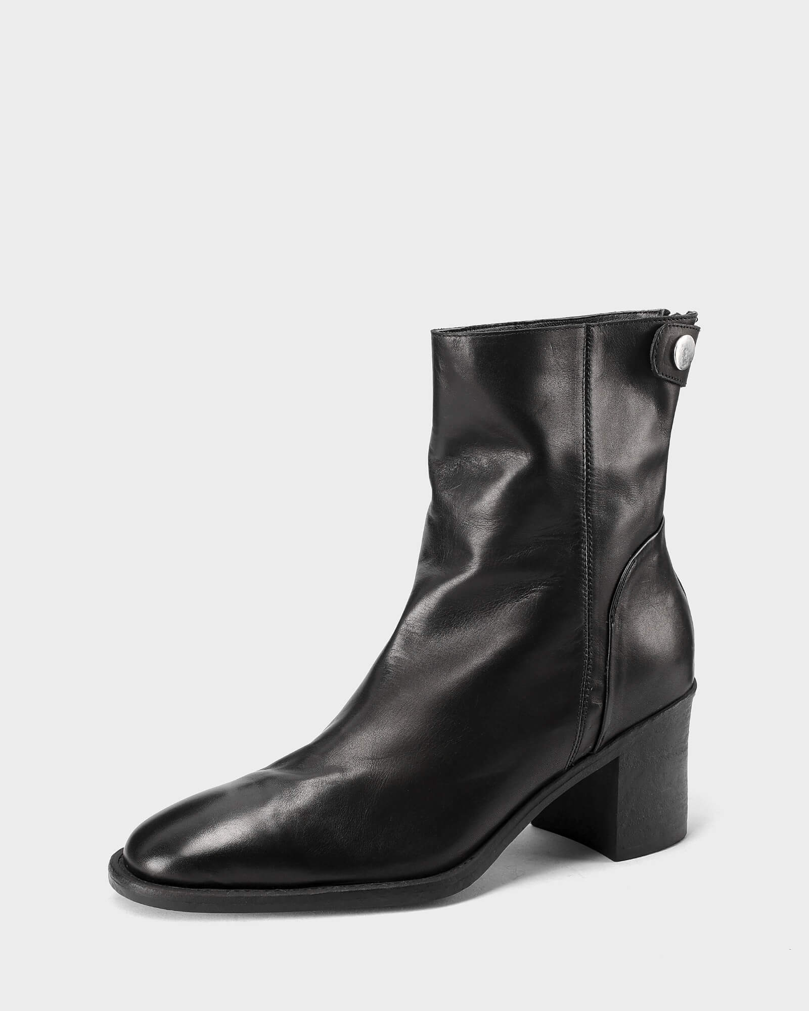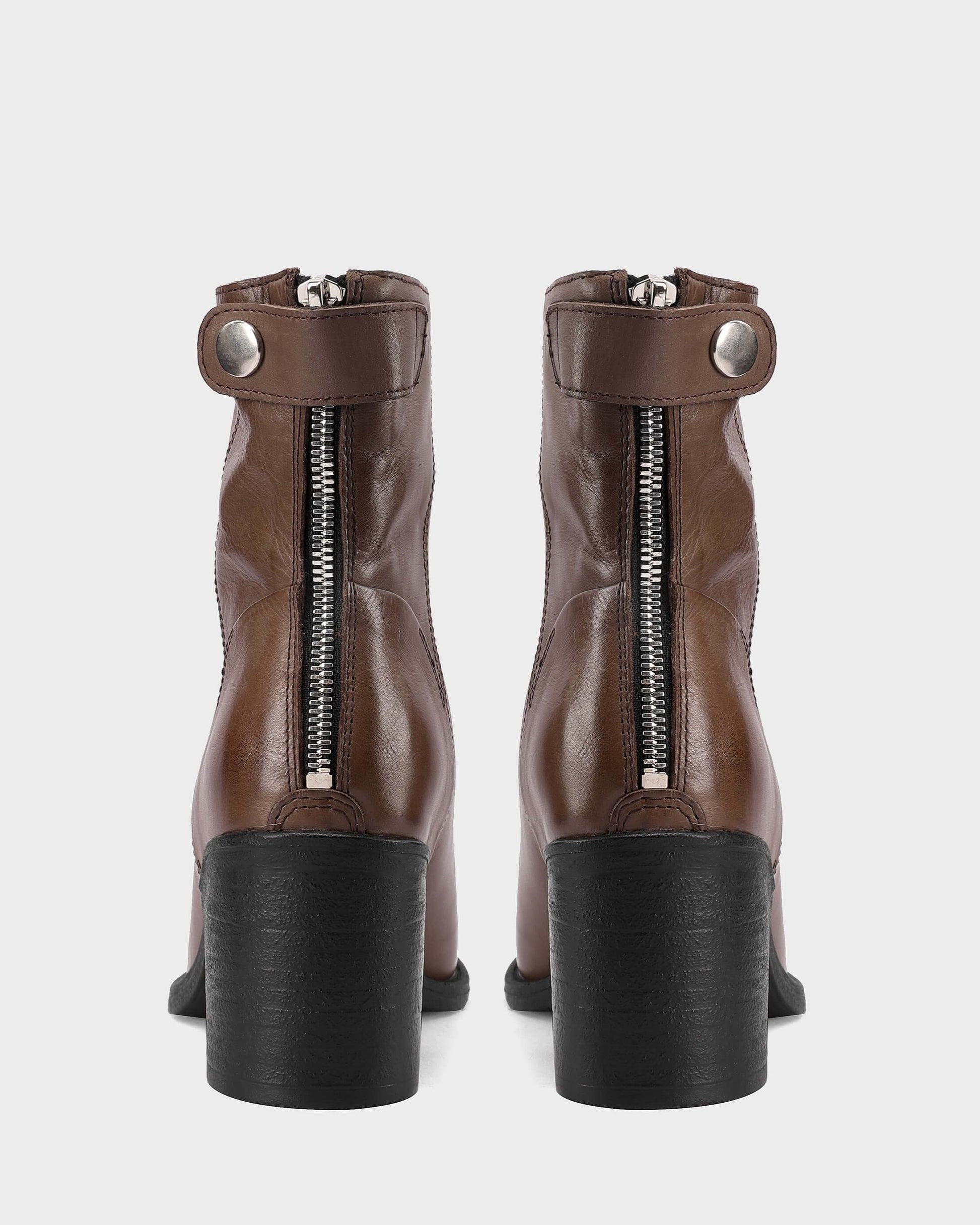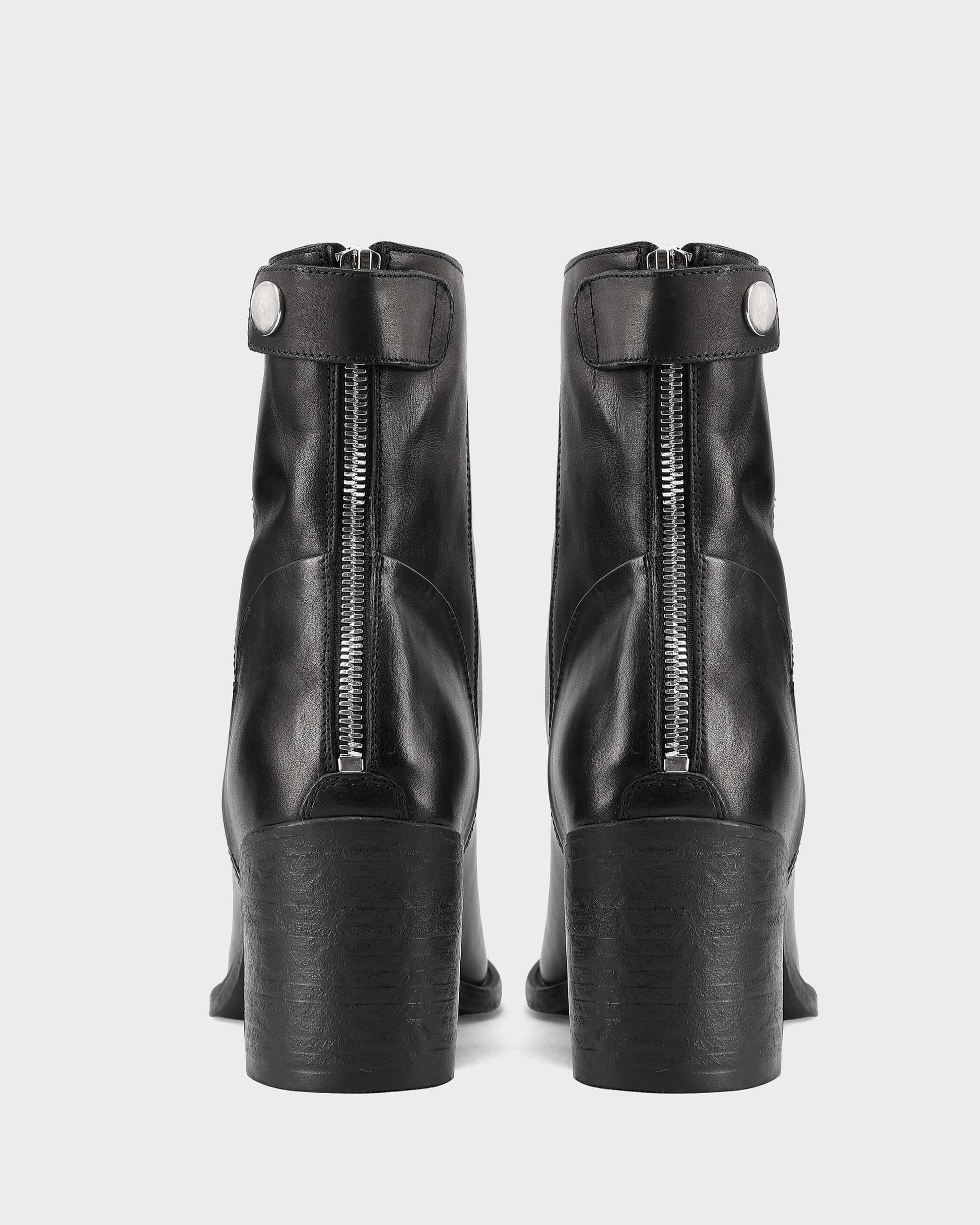 Puntera redonda, tacón bloque, cremallera trasera y hebilla para cierre.