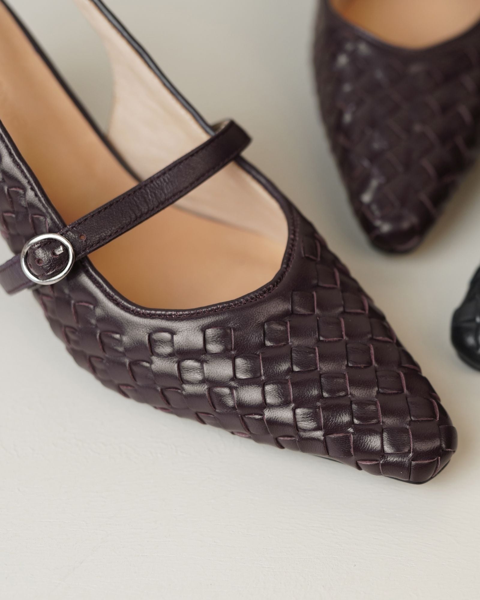 Nuestros icónicos tacones Misora, reinventados en un estilo Mary Jane. Definidos por una silueta de tira trasera y un intrincado detalle tejido, este diseño de piel de cordero se termina con una punta afilada y un tacón de aguja delgado, logrando el equilibrio perfecto entre la feminidad atemporal y el atractivo moderno.