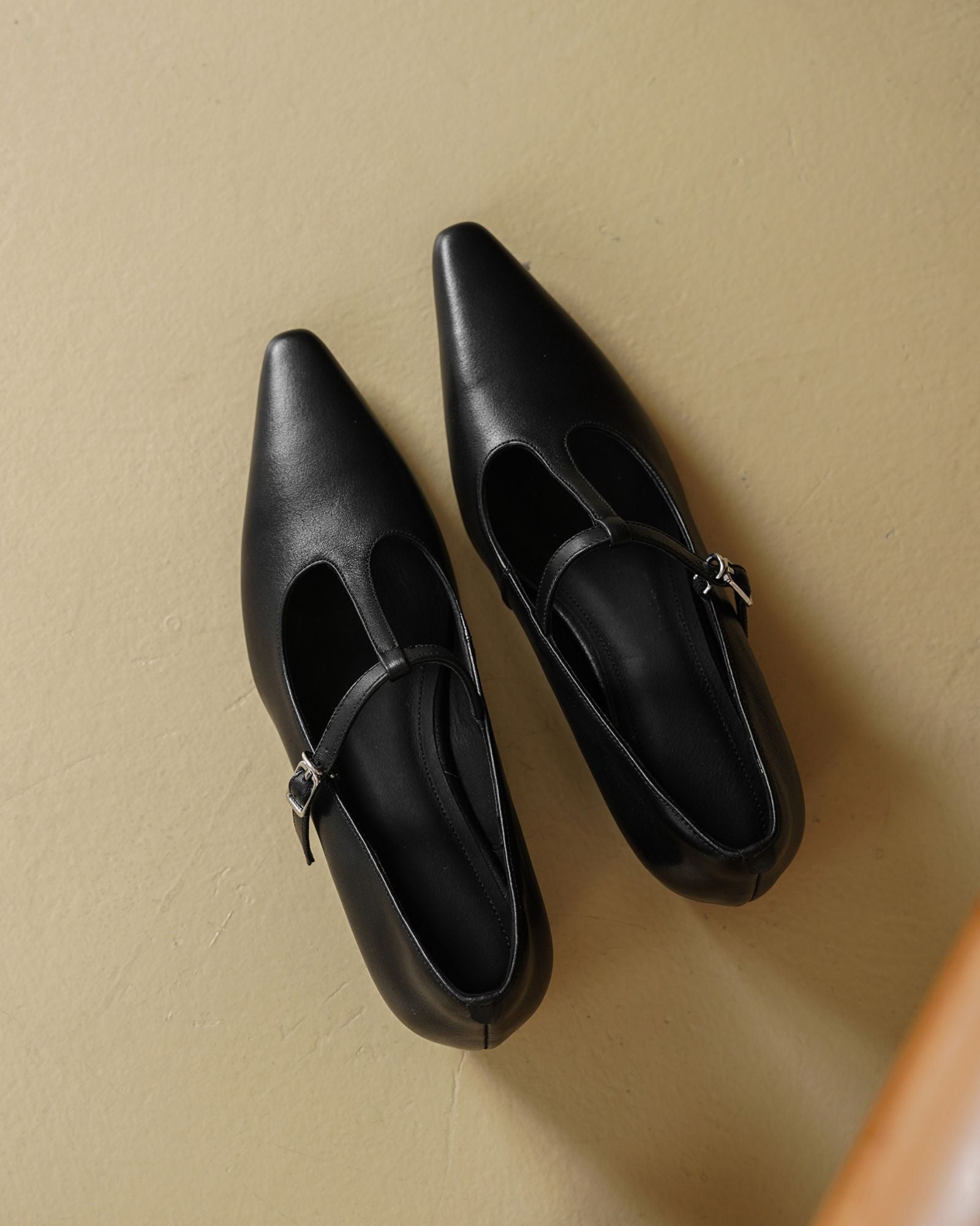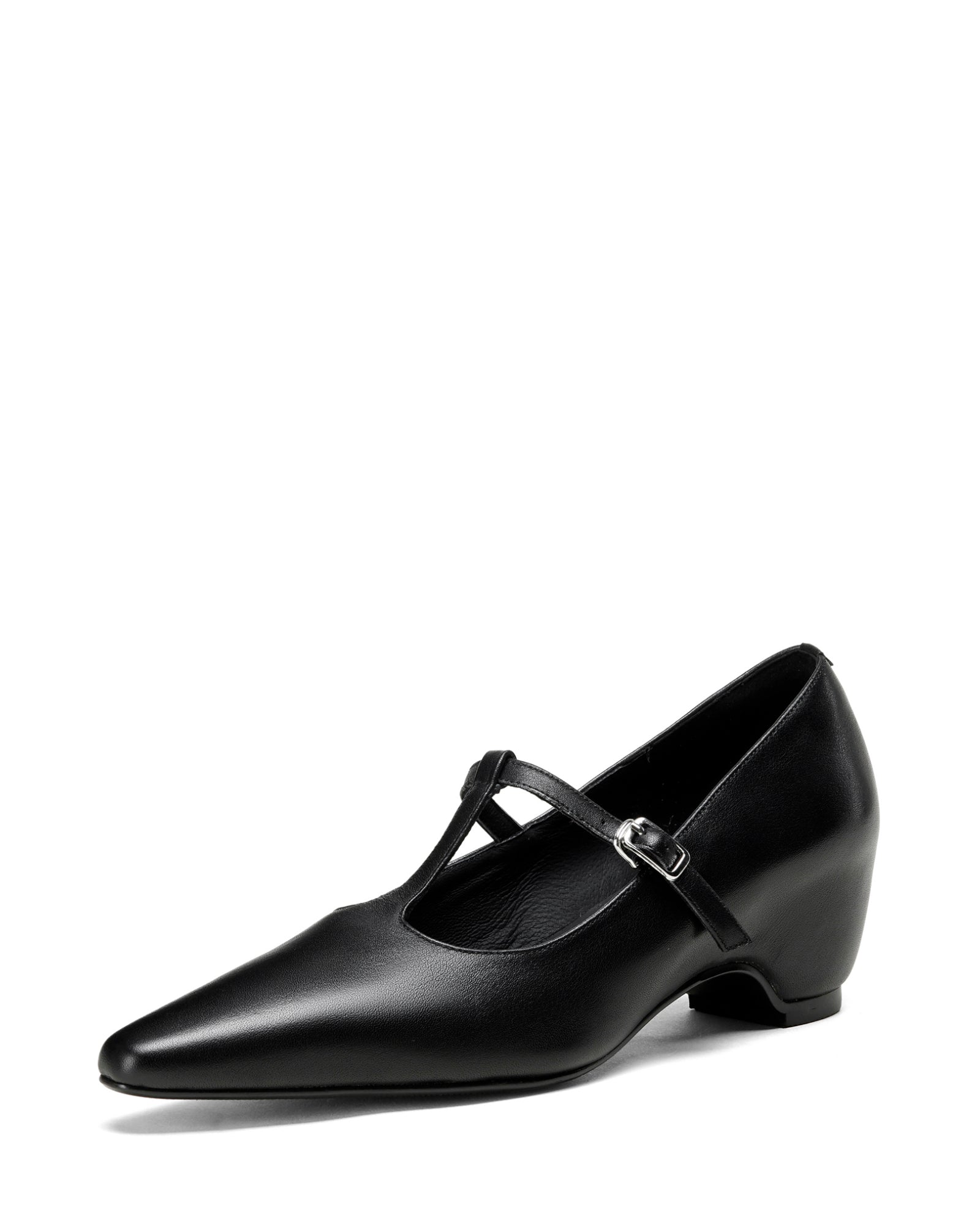 T strap pumps feature a Mary Jane profile, set pointed toe and wedge heels.
