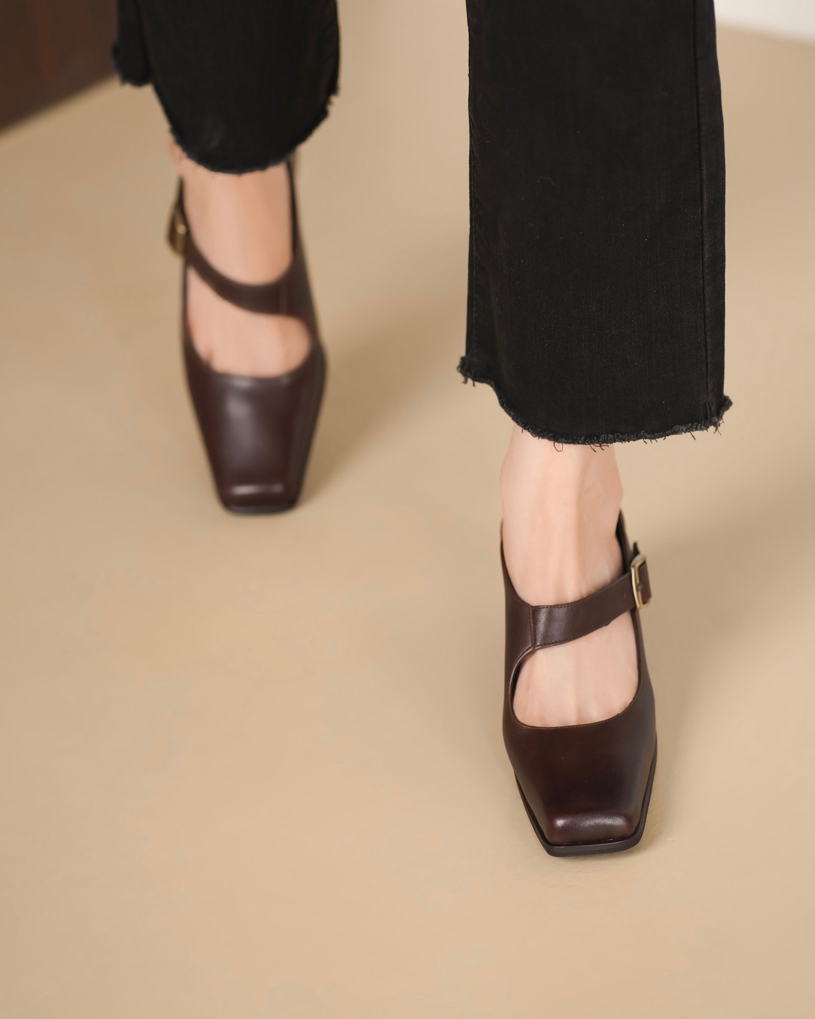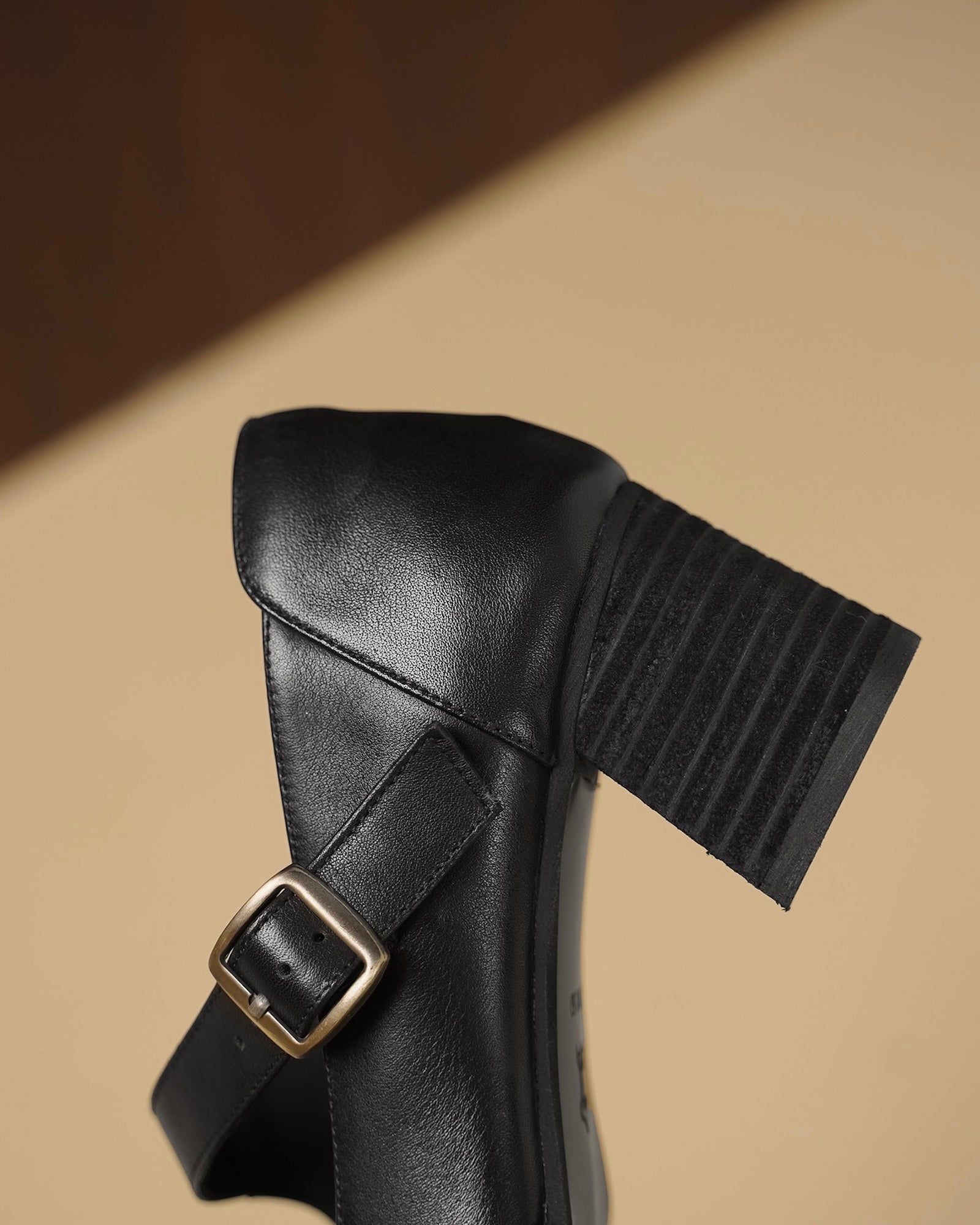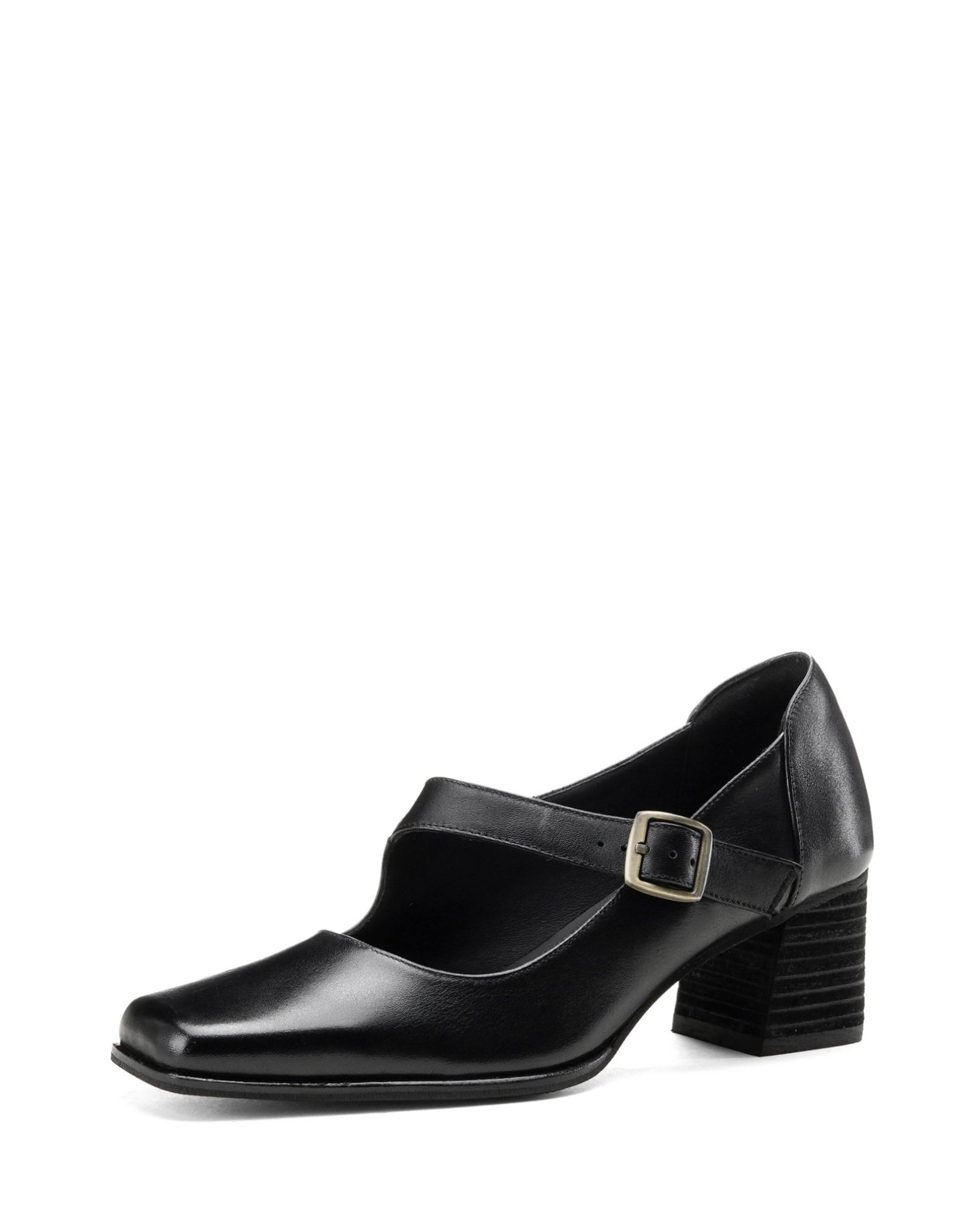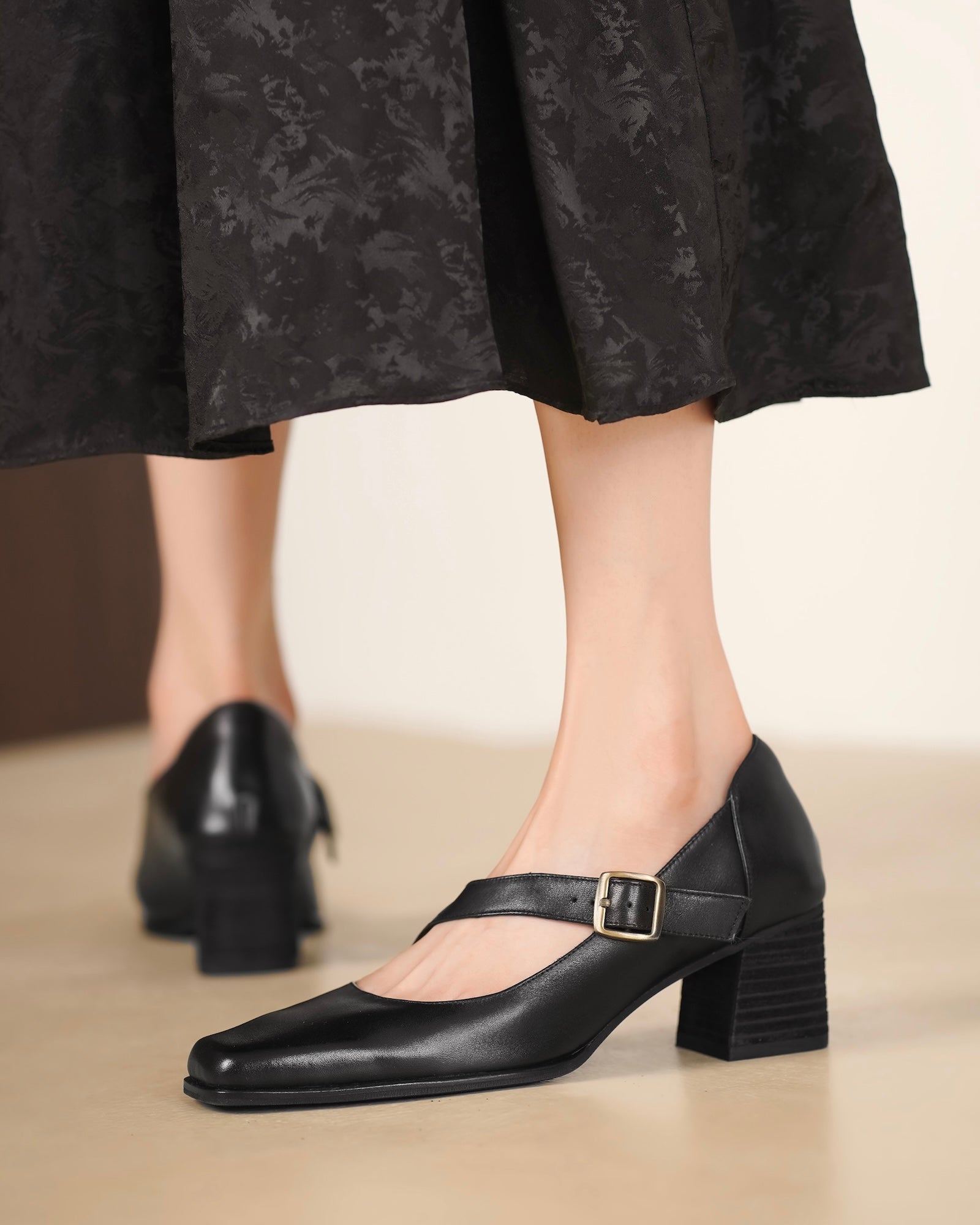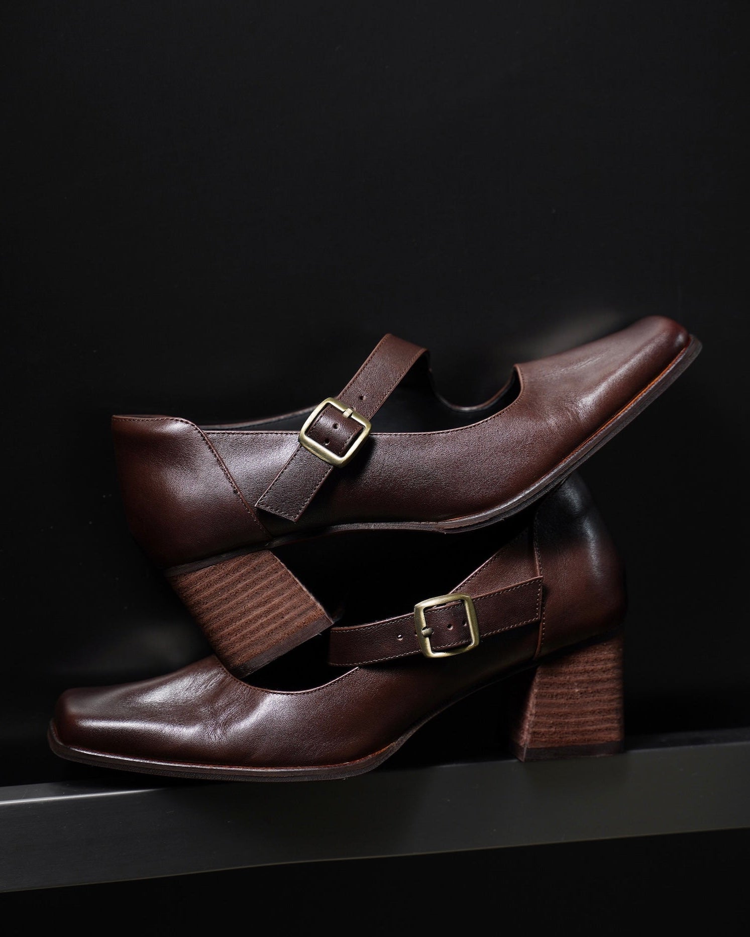 Jorma Heeled Mary Jane, featuring a chic square toe and a playful asymmetrical instep strap. The block heel offers steady support, making these pumps perfect for dancing through your day or night with a wink of vintage charm and modern flair.