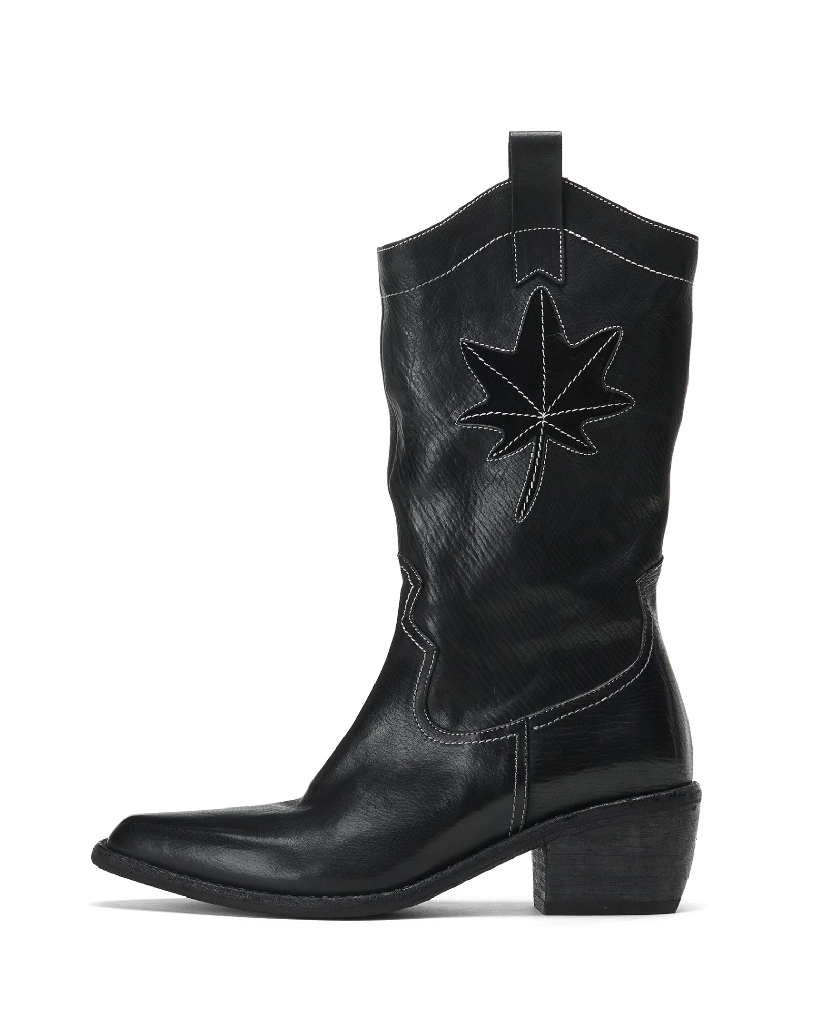 Horsehide mid calf boots, feature a Western style in pointed toe toe, pull-on, contrast stitching and stacked leather heel.